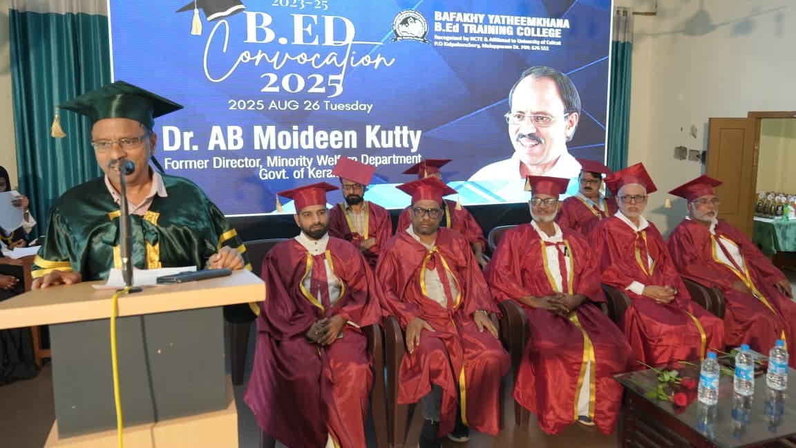 കൽപകഞ്ചേരി: ബാഫഖി യത്തീംഖാന ബി.എഡ് കോളേജിൽ ബി.എഡ് 2023-25 ബാച്ച് കോൺവൊക്കേഷൻ കേരള മൈനോറിറ്റി ഡിപ്പാർട്ട്മെൻ്റ് മുൻ ഡയറക്ടർ ഡോ. എ.ബി മൊയ്തീൻ കുട്ടി ഉദ്ഘാടനം ചെയ്തു. അധ്യാപനം മനുഷ്യൻ്റെ ആത്മാദിമാനം സംരക്ഷിക്കുന്ന പരിശുദ്ധ ദൗത്യമെന്ന് അദ്ദേഹം പറഞ്ഞു. ബാഫഖി വിദ്യാഭ്യാസ സമിതി കൺവീനർ ഹുസൈൻ ജിഫ്രി തങ്ങൾ അധ്യക്ഷത വഹിച്ചു.
